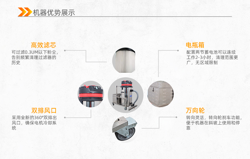 电瓶式吸尘器拥有着与电线式吸尘器一样的吸尘器功能,用电瓶作为其动力提供,是为更方便操作而决定的,而不用像电线式吸尘器一样受到电压和电源线长度等因素的限制。同时,工业用吸尘器是工业中常用的一种环保清洁设备,用于工业生产过程中收集废弃物、过滤和净化空气、进行环境中粉尘及颗粒的清扫。